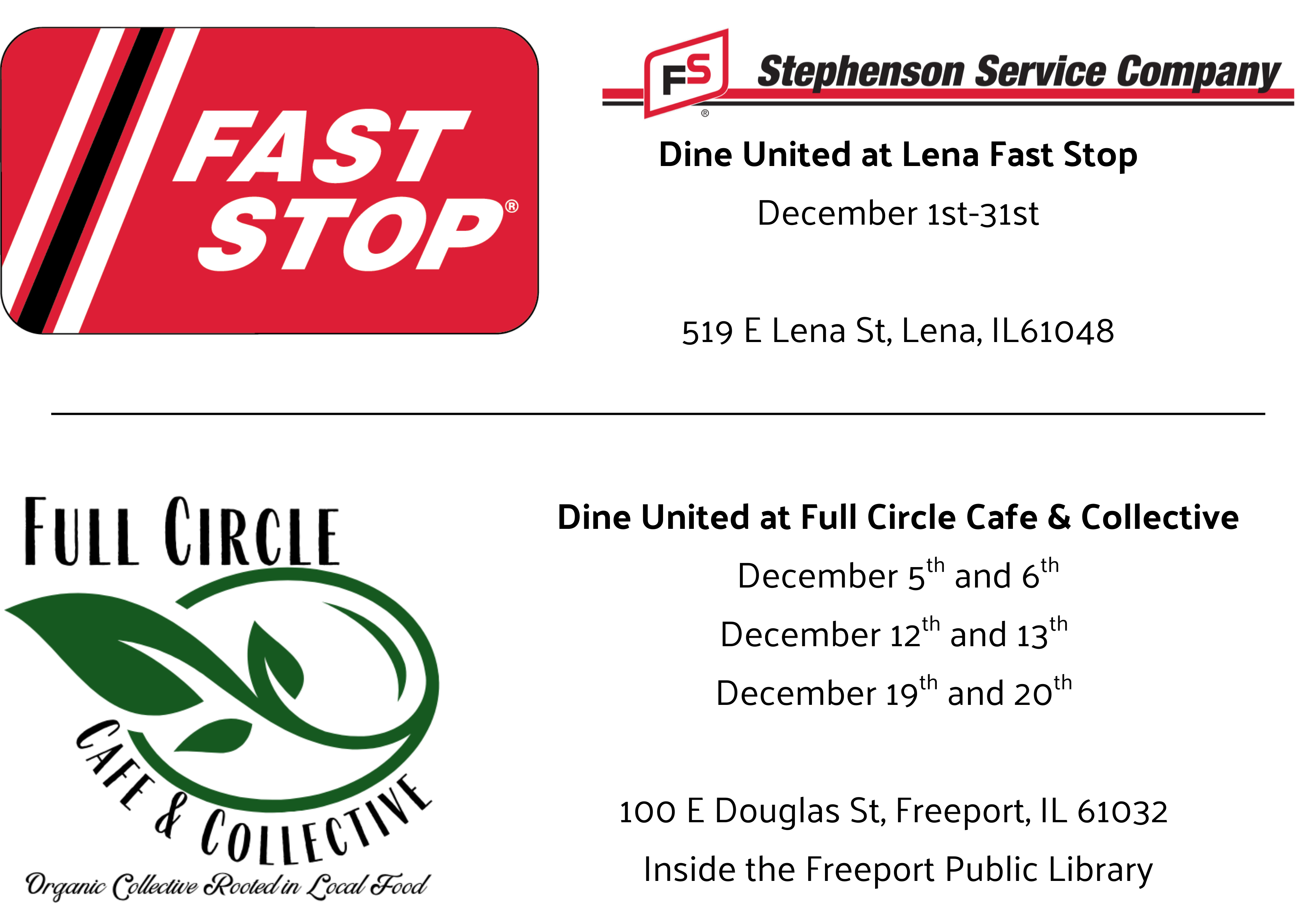 Dine United is a community fundraising event where participating restaurants donate a portion of their proceeds from a select day or days to United Way of Northwest Illinois. Proceeds go directly towards programs that support individuals experiencing moments of financial hardship within our communities.